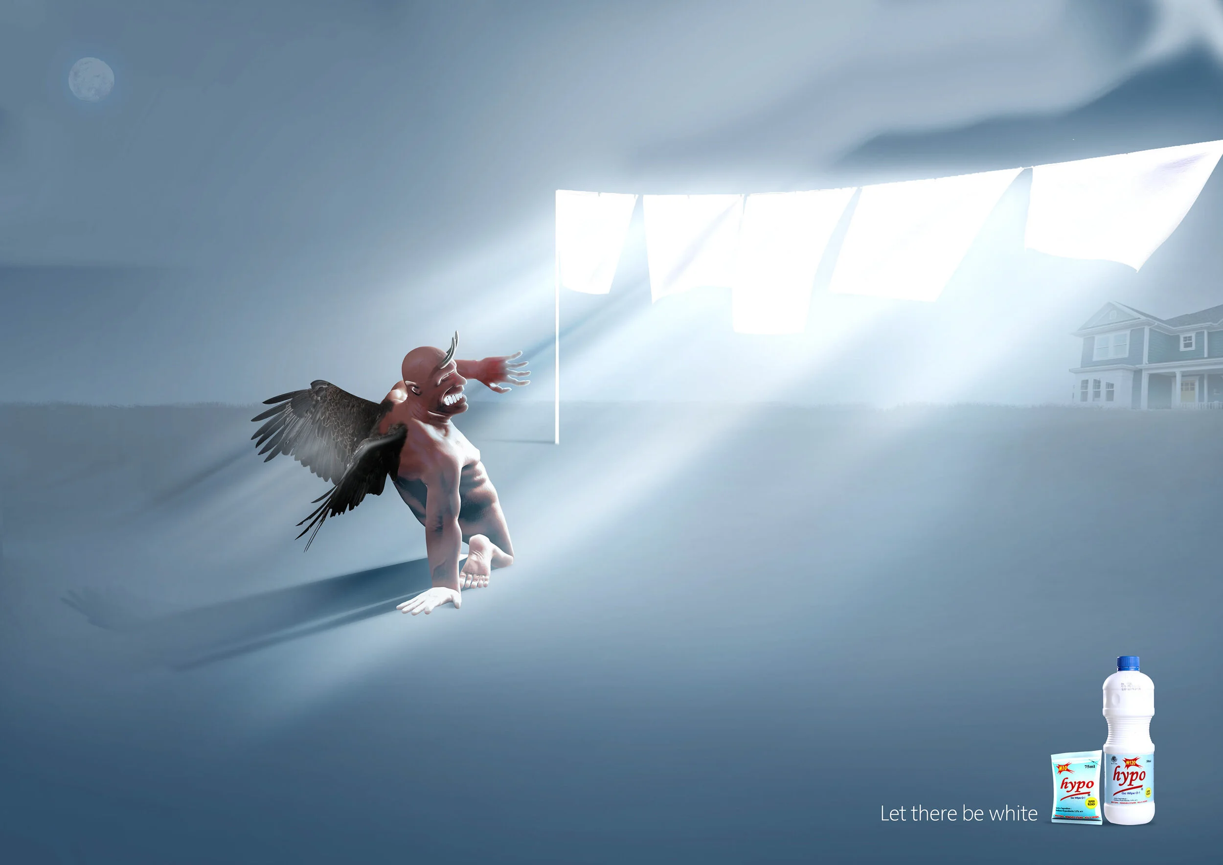 Here we explored the exaggerated effect of bleach on whites. We posed the question, "How can we represent the extreme brightness of an outfit when freed from the constraints of reality?" The conclusion suggests that the level of whiteness achieved could be so intense that even the embodiment of darkness would find it unapproachable.